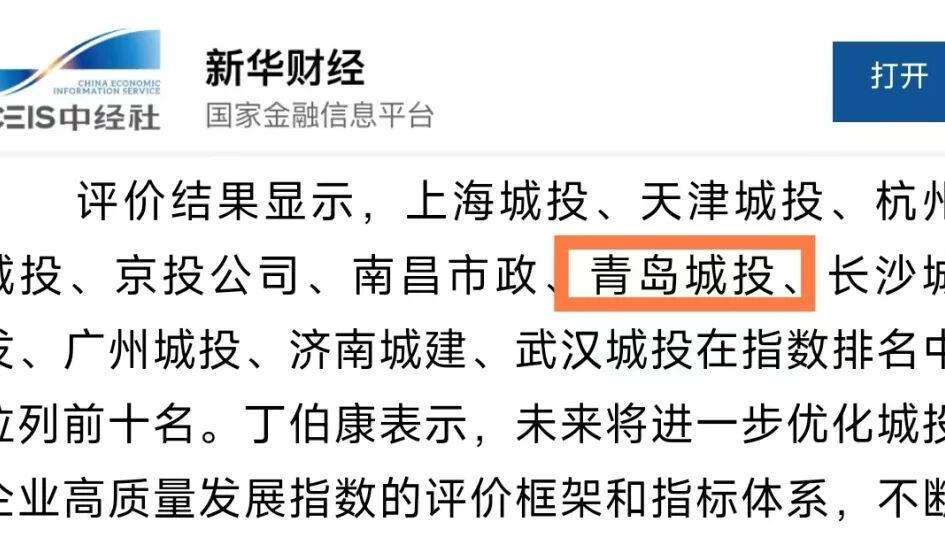 青島城投集團(tuán)榮登中國(guó)城投企業(yè)高質(zhì)量發(fā)展指數(shù)排行榜第六名